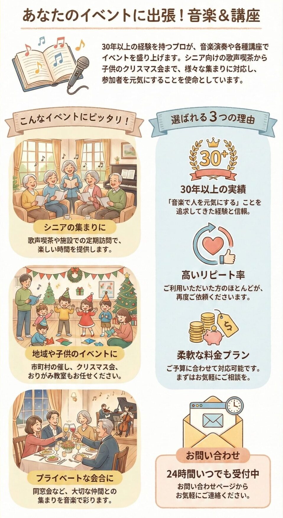 市町村でのイベント、シニアの方へ向けた歌声喫茶やおりがみ教室、こどものクリスマス会、施設での定期歌声、同窓会などで演奏や講座を行っています。