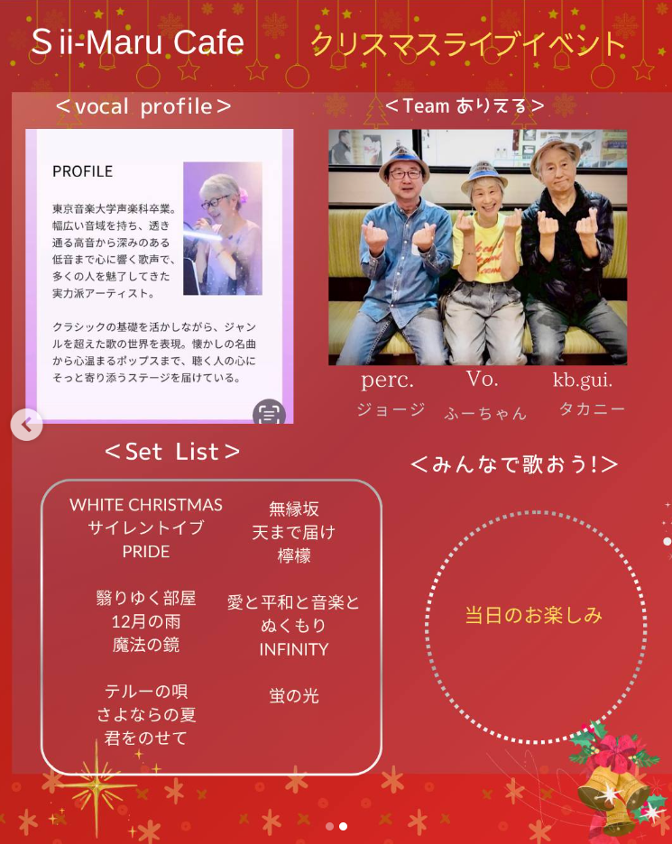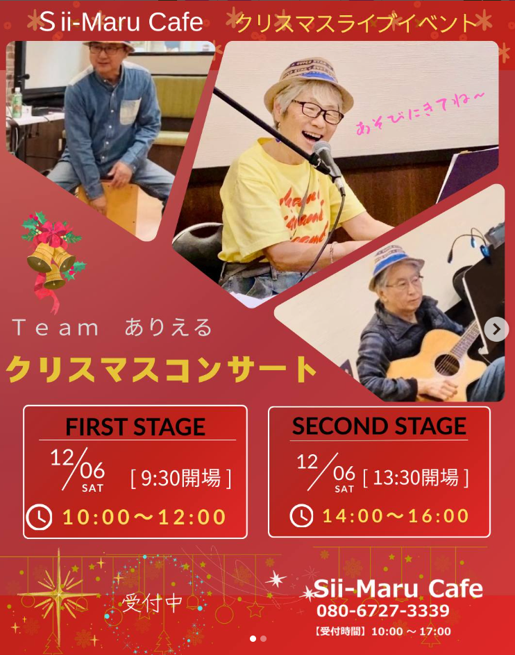 TeamありえるクリスマスコンサートをSii-Maru Cafe(しいまるカフェ)で開催します🎤開店6周年記念イベントで大好評につき今回は2回ステージ開催します🥳